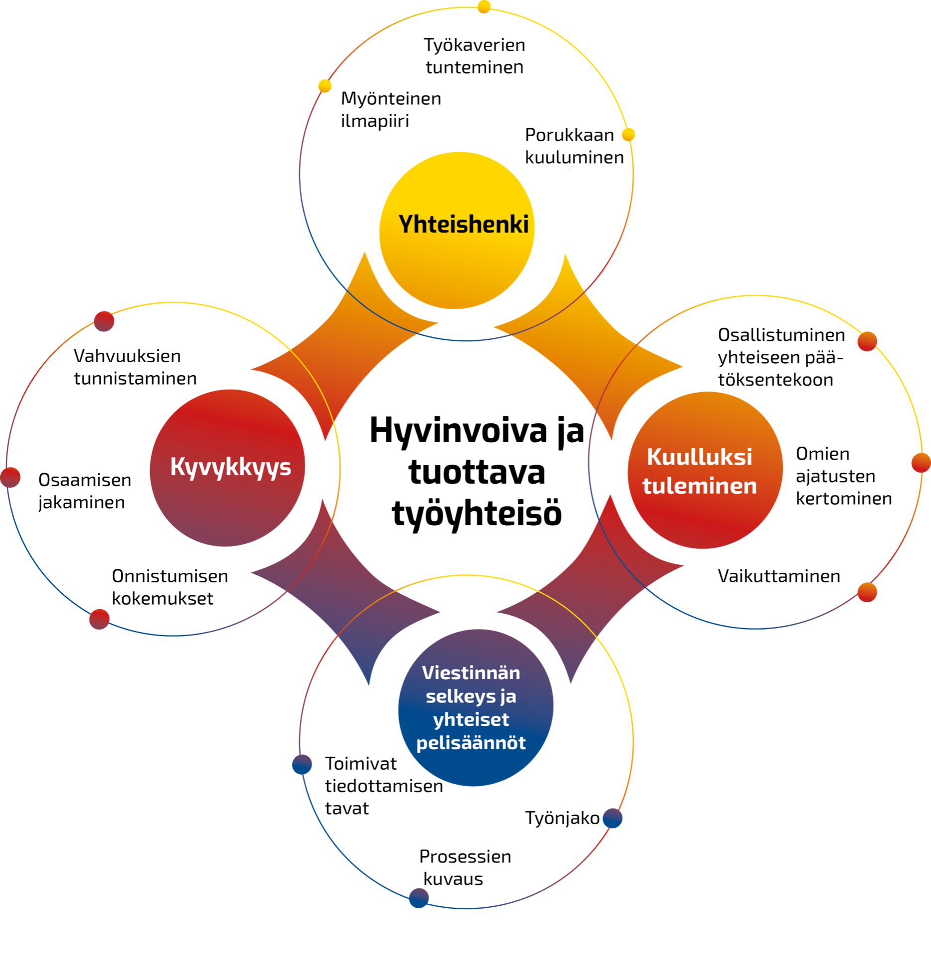 Työyhteisössä yhteisön jäsenet voivat hyvin ja vuorovaikutus toimii, kun neljän osa-alueen tekijät on huomioitu. Koulutuksissamme käymme läpi nämä perustekijät, pohdimme, miten niihin voisi vaikuttaa sekä tuomme konkreettisia menetelmiä niiden kehittämiseen.